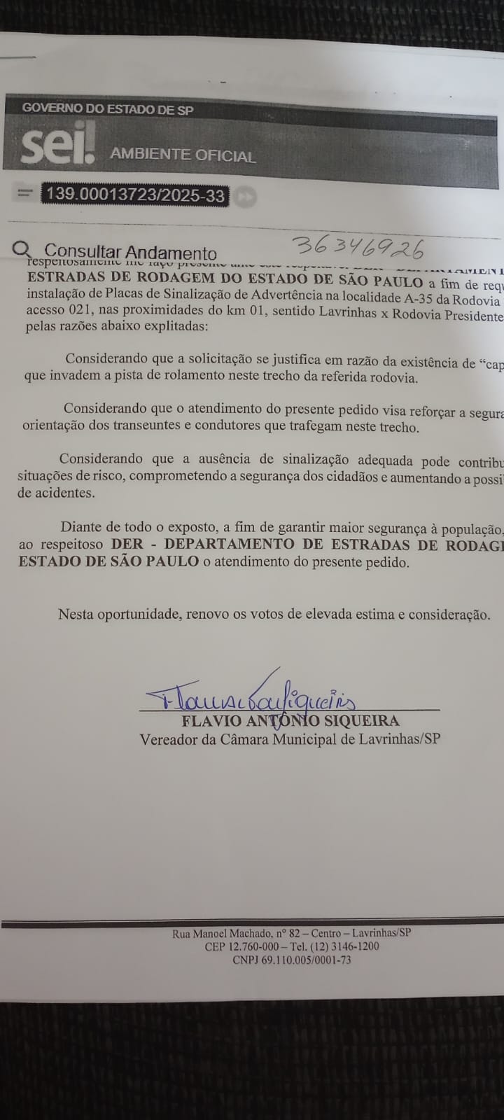 No dia 05/02/2025, foi protocolada junto ao DER, uma solicitação do Vereador Babi, para colocação de placas informativas de animais silvestres na Rodovia Júlio Fortes. Sabemos que vários cidadãos lavrinhenses, de cidades vizinhas e turistas, já se envolveram em acidentes devido a falta de informação. Como forma de amenizar o risco, aguarda-se ações do DER.